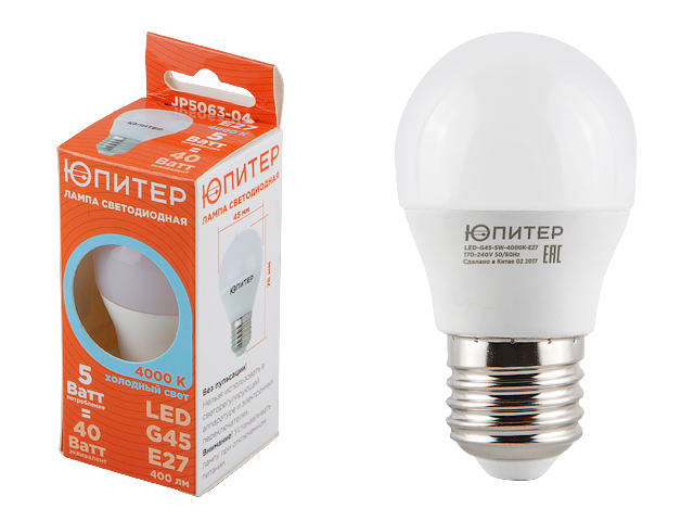 Лампа светодиодная G45 ШАР 5 Вт 170-240В E27 4000К ЮПИТЕР