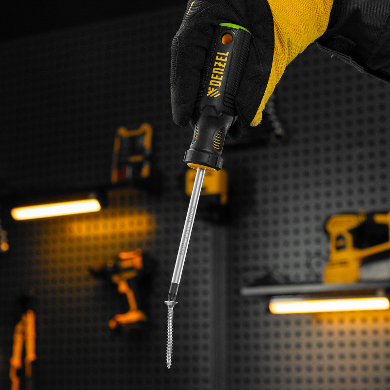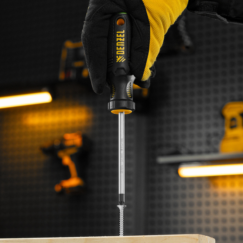Отвертка Denzel 122077 с трехкомпонентной рукояткой, со стержнем из стали S2, длиной 100 мм, имеет шлиц PZ2 и предназначена для монтажных и демонтажных работ с резьбовыми соединениями типа Pozidriv. Благодаря намагниченному высокоточному шлицу отвертку с крепежом можно направлять одной рукой, удерживая другой закрепляемую деталь. Инструмент подходит для профессионального использования.