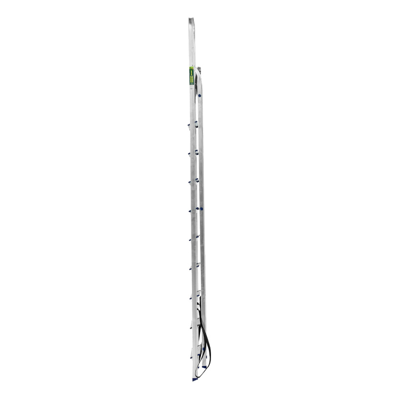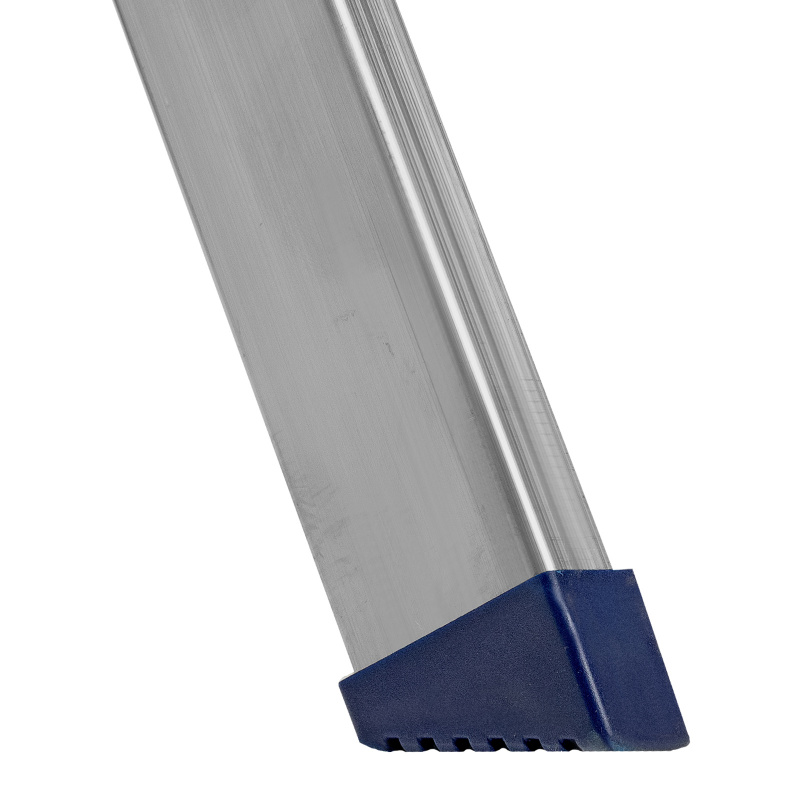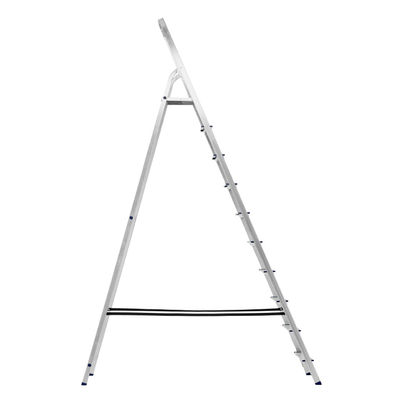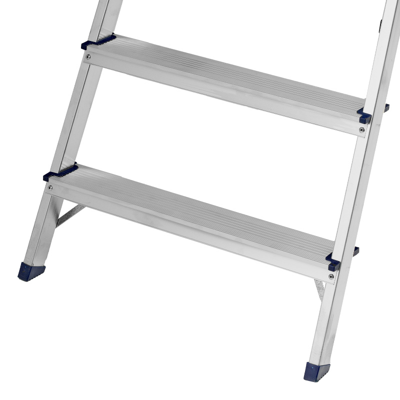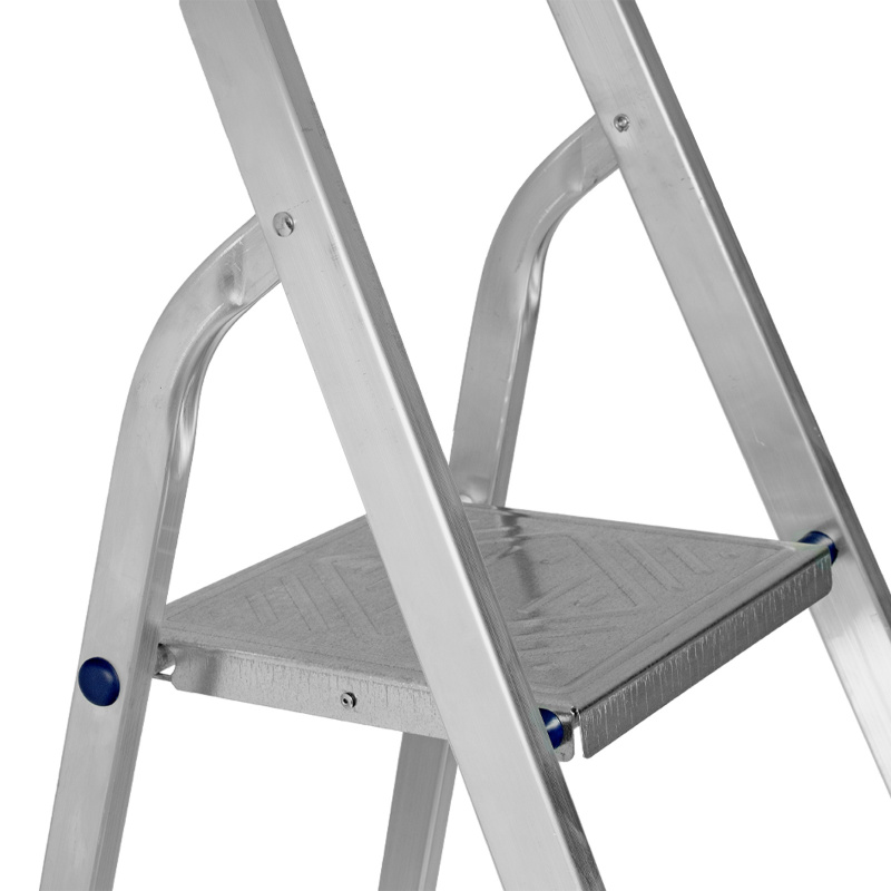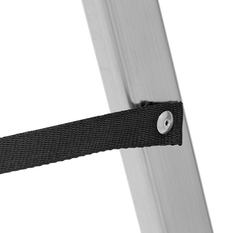 - Надежность — рама из прямоугольного алюминиевого профиля выдерживает нагрузку до 150 кг, широкие ступени закреплены заклепками, страховочные стяжки повышают прочность конструкции.