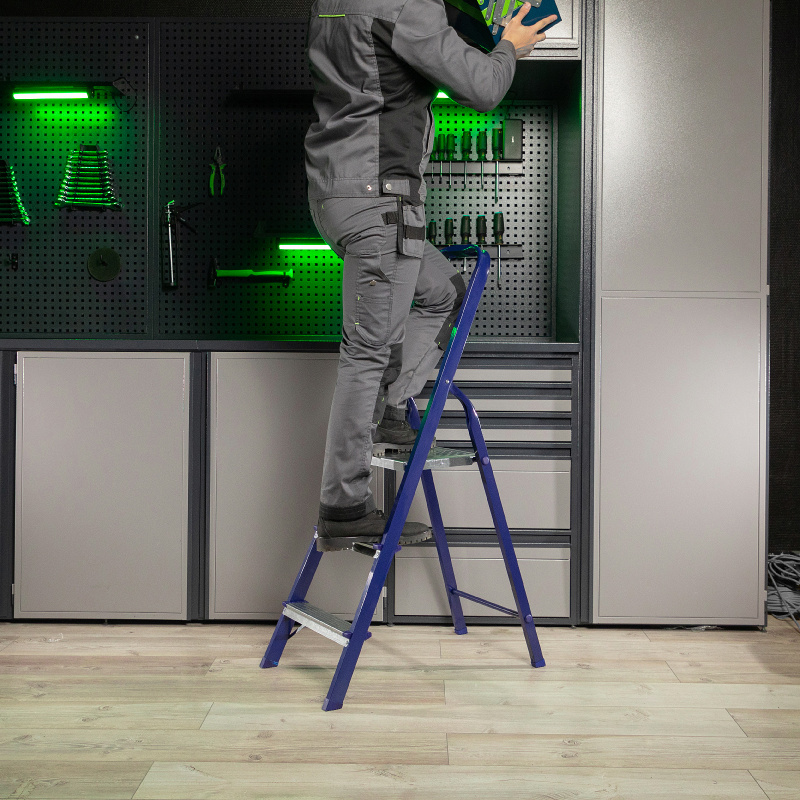 - Удобное хранение — размеры стремянки в сложенном состоянии составляют 1310 х 400 х 105 мм.