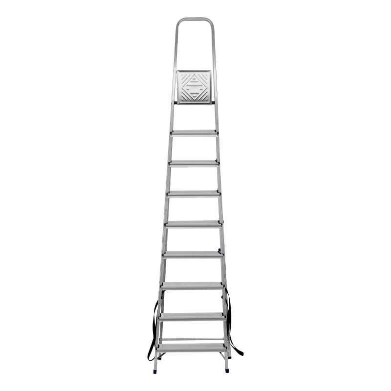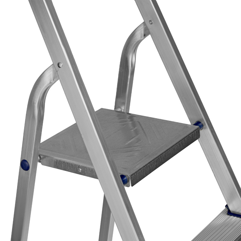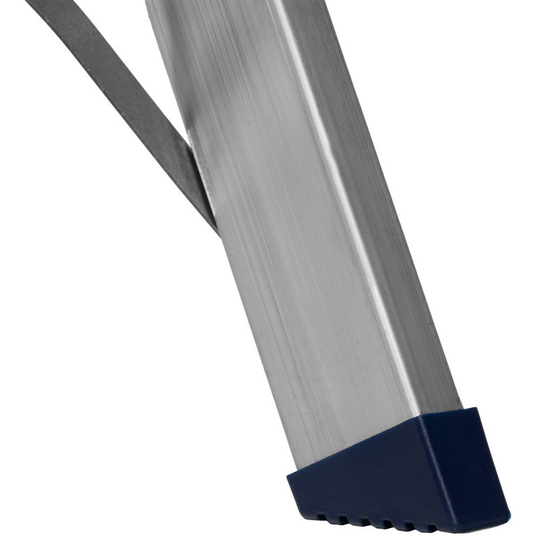 - Надежность — рама из прямоугольного алюминиевого профиля выдерживает нагрузку до 150 кг, широкие ступени закреплены заклепками, страховочные стяжки повышают прочность конструкции.
